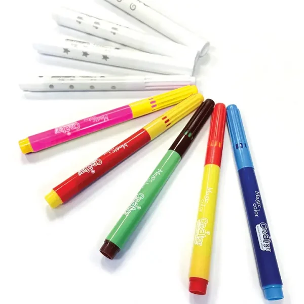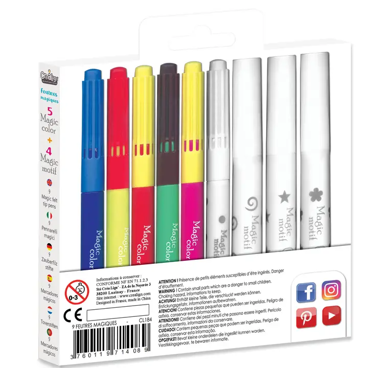 Ce set comprend 5 feutres de couleurs classiques et 4 feutres Magic Motif pour dessiner de façon ludique et créative. Les enfants peuvent s’amuser à transformer leurs dessins et explorer différentes combinaisons pour des créations uniques.