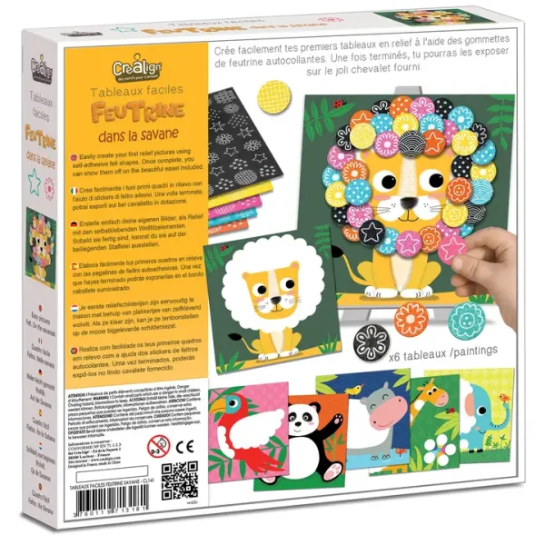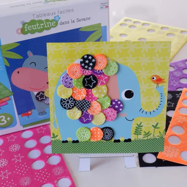 Ce coffret permet aux enfants de réaliser leurs premiers tableaux en relief grâce à des gommettes autocollantes en feutrine. Douces au toucher et faciles à manipuler, elles offrent une approche ludique de la création artistique.