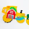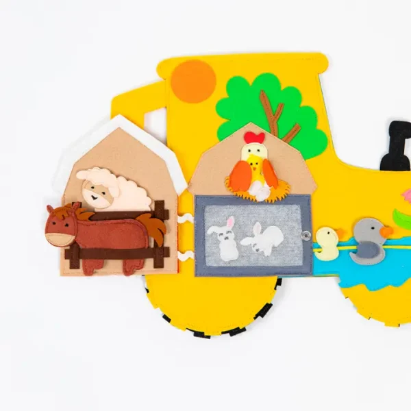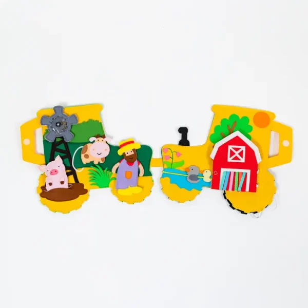 Grand tracteur jaune compagnon de voyage avec fermier et animaux, conçu pour combiner jeu et apprentissage. Il permet aux enfants de développer différentes compétences tout en s’amusant.