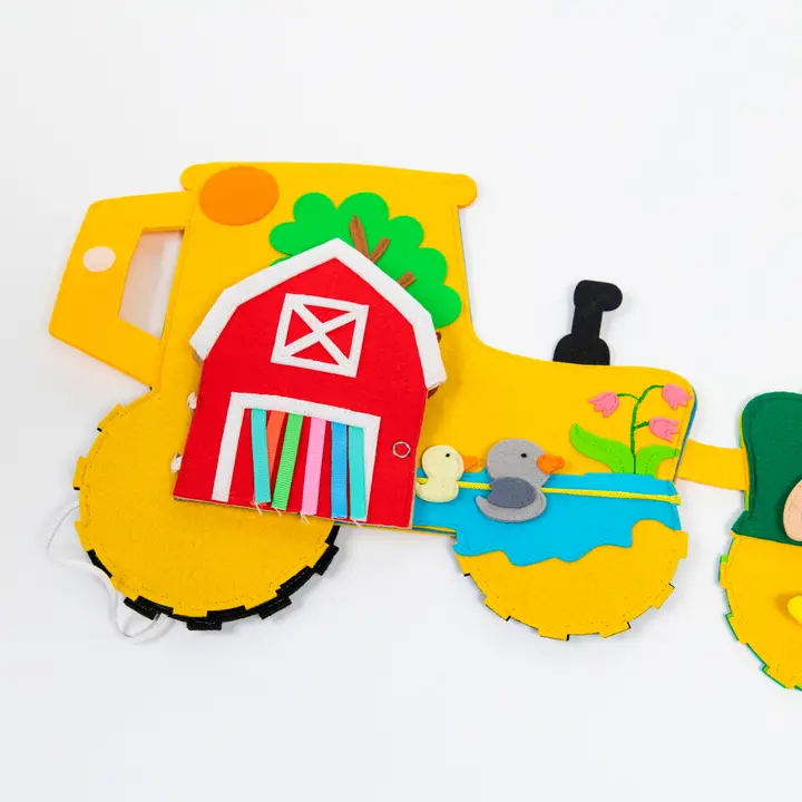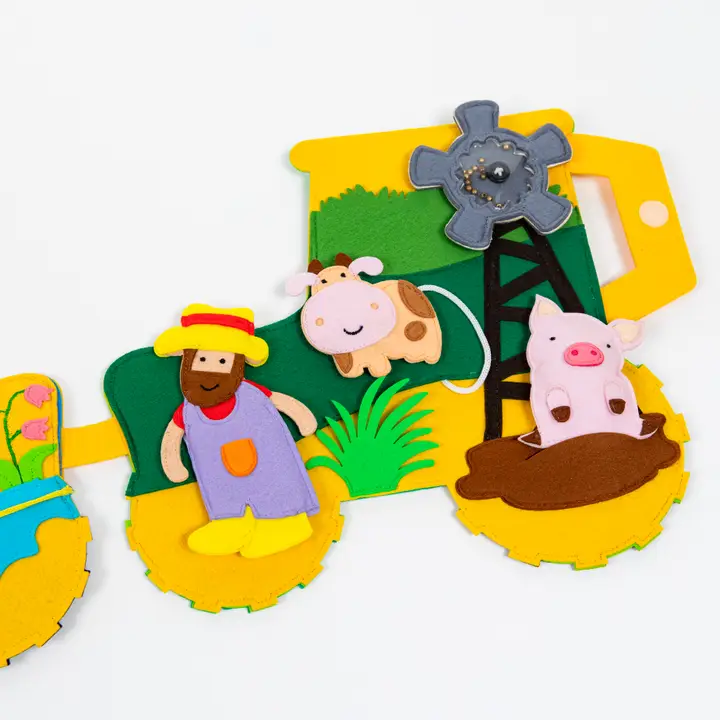 Grand tracteur jaune compagnon de voyage avec fermier et animaux, conçu pour combiner jeu et apprentissage. Il permet aux enfants de développer différentes compétences tout en s’amusant.