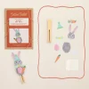 Les matériaux inclus sont des découpes en carton, une pince à linge en bois servant de poupée et des pastilles de colle. Chaque kit est présenté dans une enveloppe kraft recyclable de 16,5 x 11,5 cm, accompagnée d’une carte d’instructions imprimée au format A6.