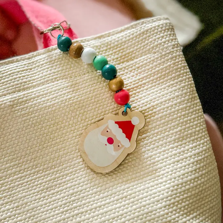 Les matériaux inclus sont un pendentif Père Noël en bois, des perles sphériques, un anneau de porte-clés et un élastique avec embouts métalliques. Chaque kit est présenté dans une pochette kraft recyclable de 16,5 x 11,5 cm, accompagnée d’une carte d’instructions imprimée au format A6.
