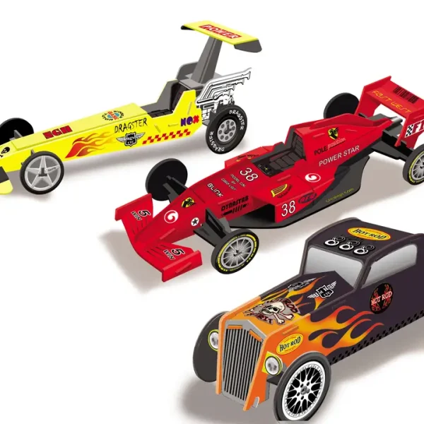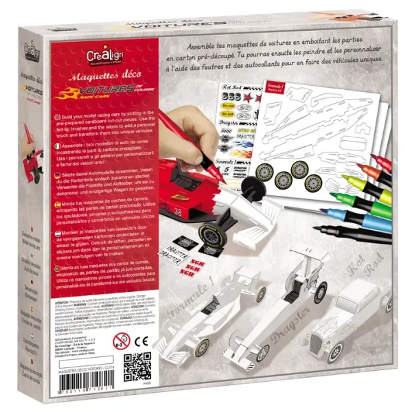 Une fois les modèles montés, les enfants pourront les peindre et les personnaliser à l’aide des feutres et des autocollants inclus, afin de créer des voitures uniques à leur image. Une activité ludique qui stimule l’imagination, la créativité et la motricité fine.