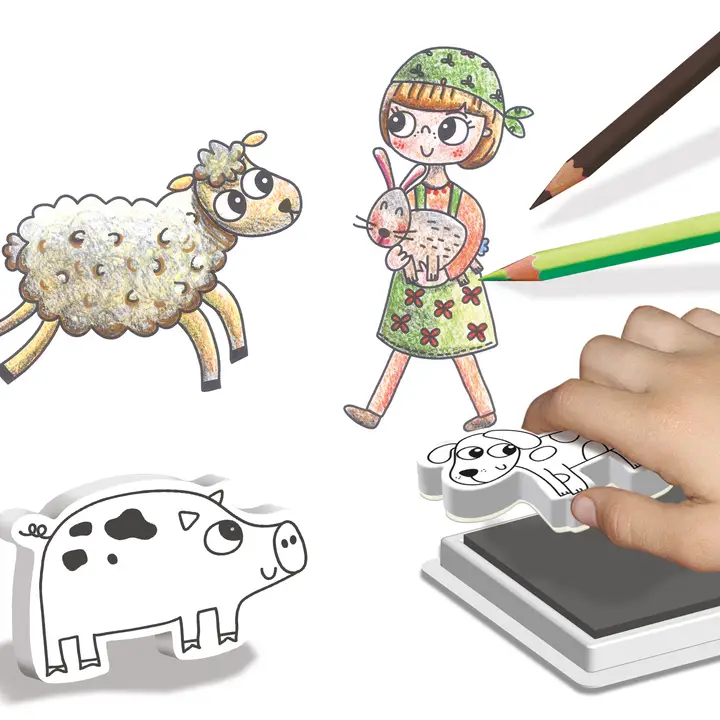 Ce coffret de tampons permet aux enfants de créer des personnages et d’imaginer des histoires autour de l’univers de la ferme. En combinant les motifs, ils peuvent composer des scènes variées et donner vie à leurs propres dessins.
