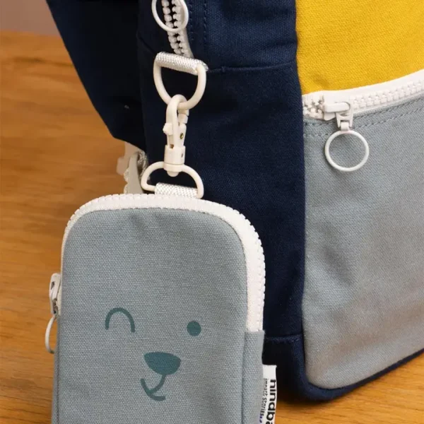 Une poche en filet sur le côté permet de garder une gourde à portée de main. À l’avant, une poche plaquée ainsi que plusieurs petites poches intérieures facilitent l’organisation des effets personnels. Un anneau latéral permet d’ajouter, en option, l’accessoire Billy : une petite pochette ludique dotée d’une face réfléchissante pour renforcer la sécurité.